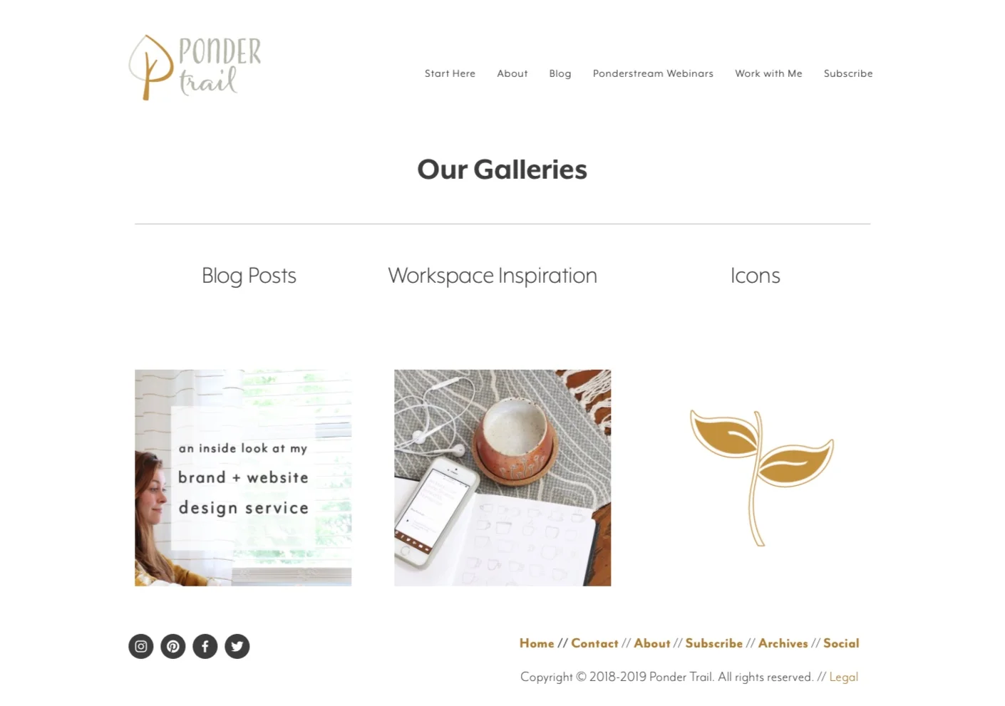 While Squarespace doesn’t have a content block to create this magic, I do have handy trick I’ve used in various ways across my website. This method actually uses several pages, and the results are so similar to a one-page feel that your audience will hardly realize it while your responsive gallery changes with a click of a button right before their eyes.